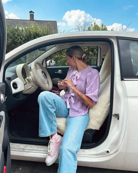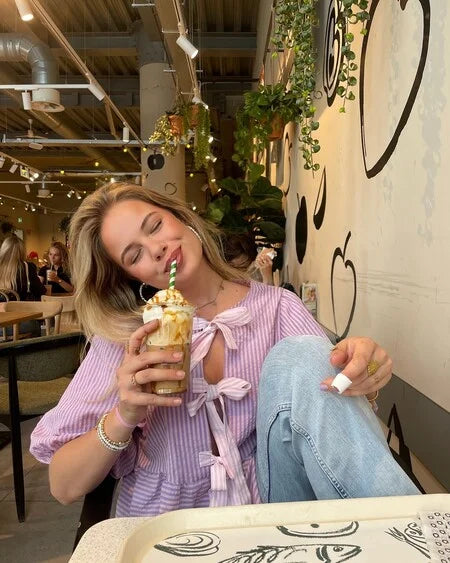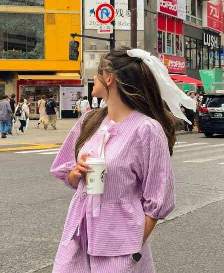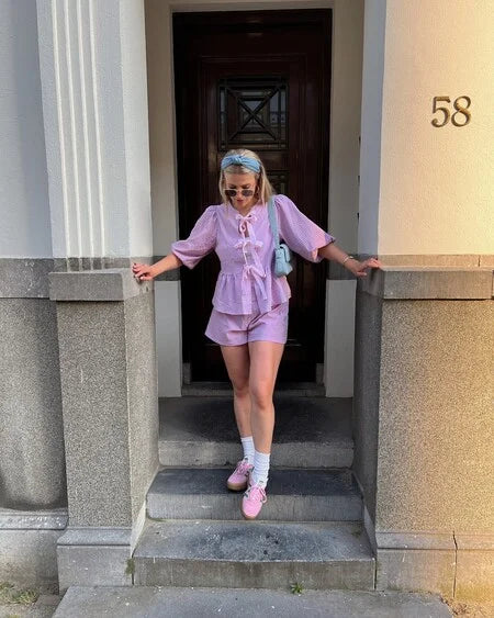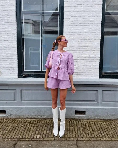 ★★★★★Add some playful elegance to your wardrobe with the Lilac Bow Tie Set! 🌸 Made from soft, lilac fabric with subtle stripes, this set is finished with charming bow details. Perfect for a fresh, stylish look that is both comfortable and fashionable. Ideal for any occasion where you want to shine!